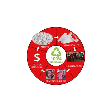 Con nuestro compactador para EPE, la compactadora de tornillo RUNI SK370 y pre-trituradoras el EPE puede ser compactado a bloques uniformes con una densidad de 500 kg/m3 o 30 lbs/ft3. Si solo tienes trozos pequeños puede que la pre-trituradora no sea necesario.
